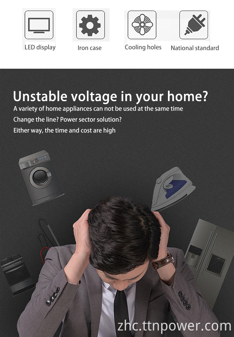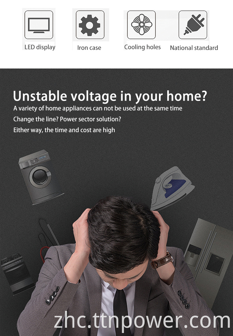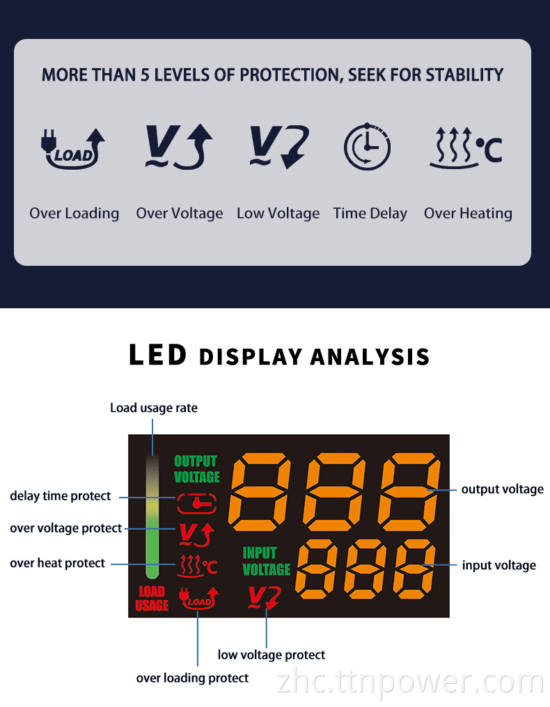 4.低电压保护(输出电压<185V+/-5V),过压保护(输出电压>245v+/-5v),过载>110%,过热>100 ℃