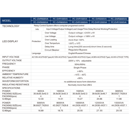 | PC-DVR500VA | PC-DVR1000VA | PC-DVR1500VA | PC-DVR2000VA | PC-DVR3000VA | PC-DVR5000VA | PC-DVR8000VA | PC-DVR10000VA | PC-DVR12000VA | PC-DVR15000VA |