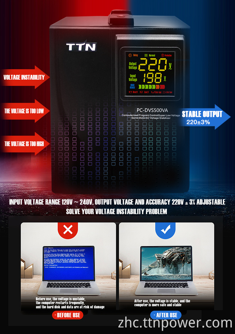 4.低电压保护(输出电压<185V+/-5V),过压保护(输出电压>245v+/-5v),过载>110%,过热>100 ℃