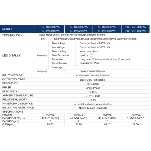 | PC-TSDC500VA | PC-TSD1000VA | PC-TSD1500VA | PC-TSD2000VA | PC-TSD3000VA | PC-TSD5000VA | PC-TSD8000VA | PC-TSD10000VA |
